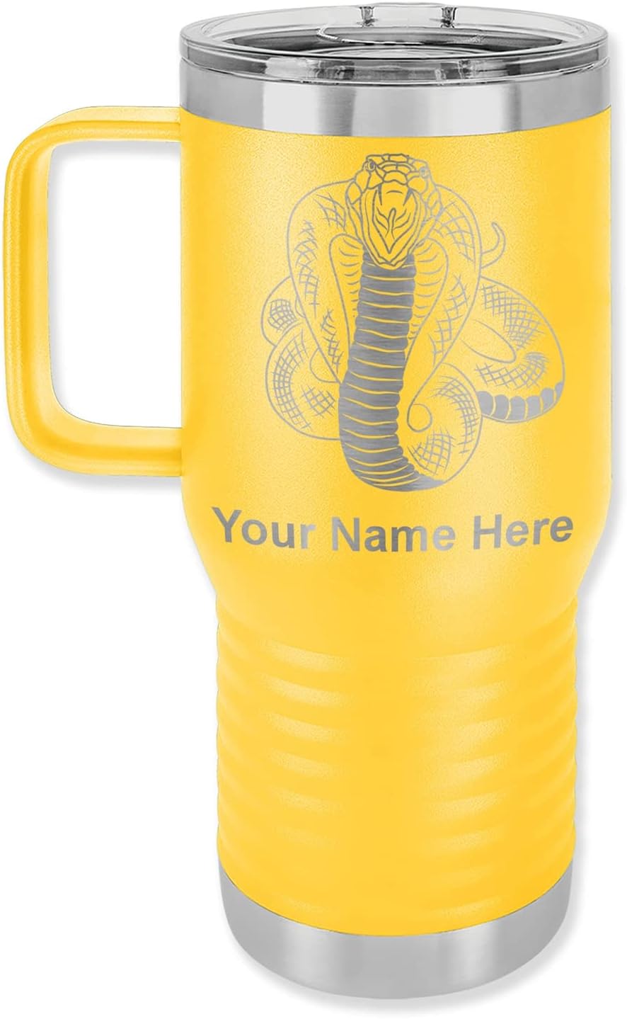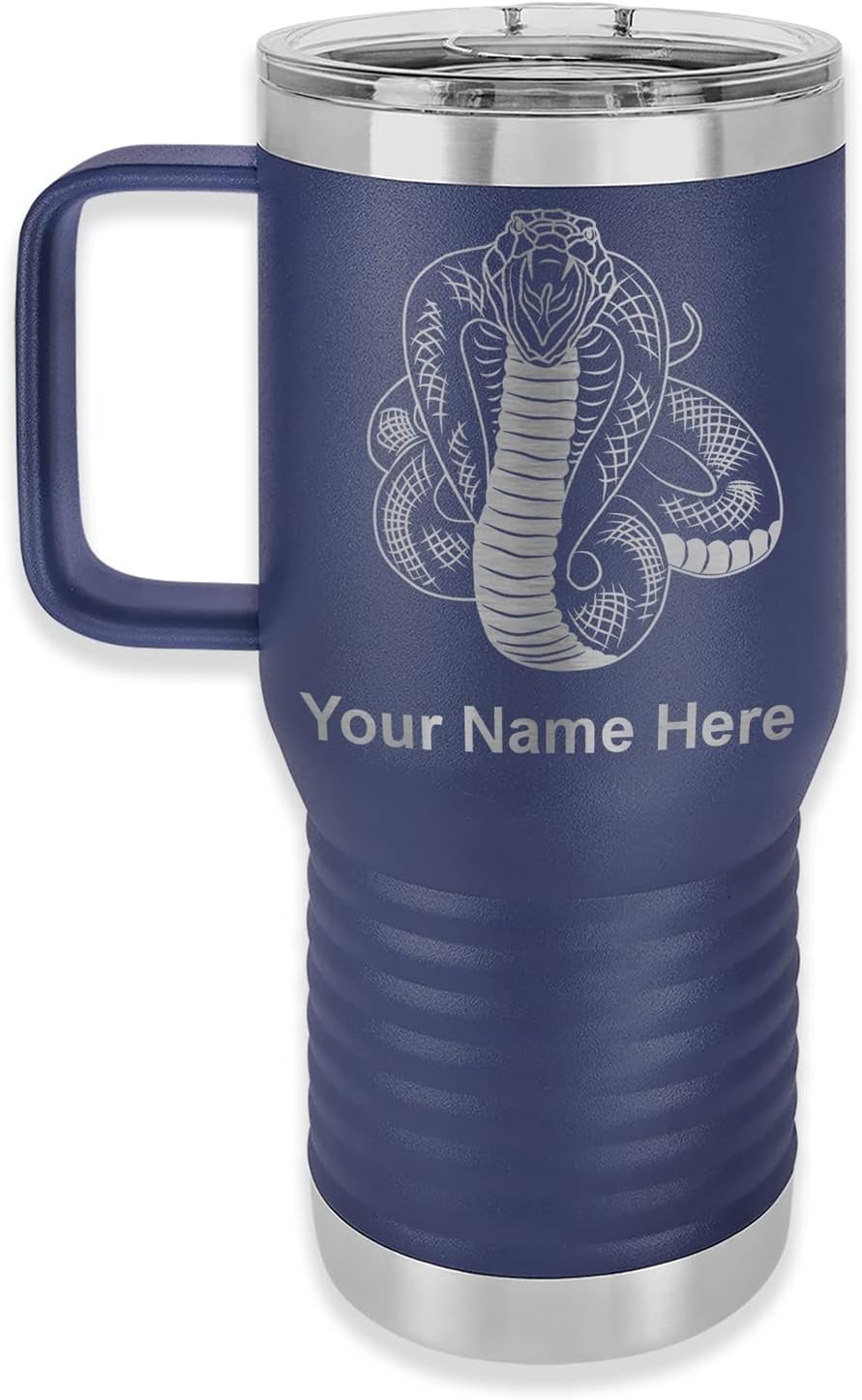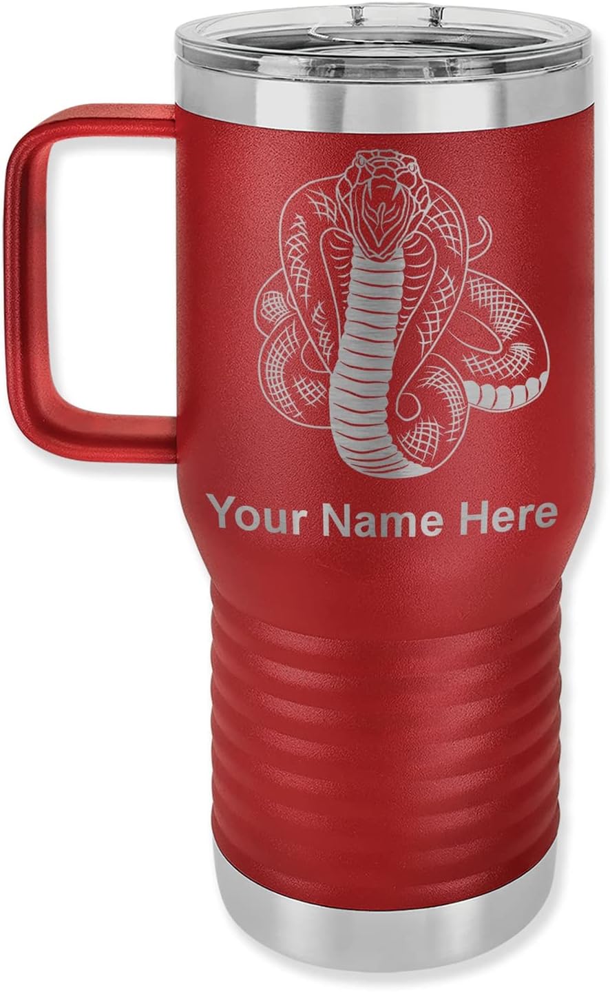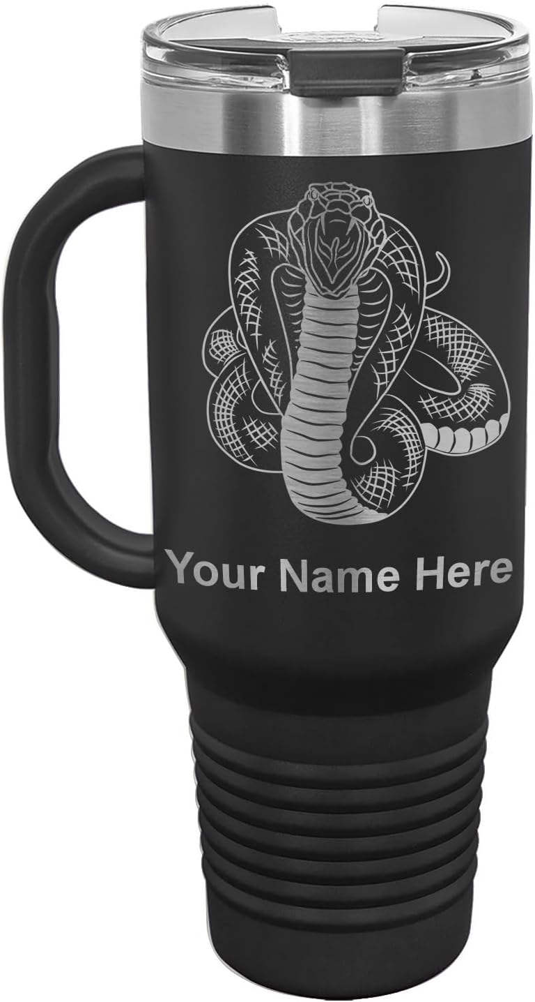 LaserGram 40 ounce Travel Mug with Handle that is laser engraved with the image that you see in the photo. Your own personalized text will be laser engraved below the image. Features double-walled stainless steel vacuum insulation with a clear lid. Click the "Customize Now" button to begin customizing your mug.
