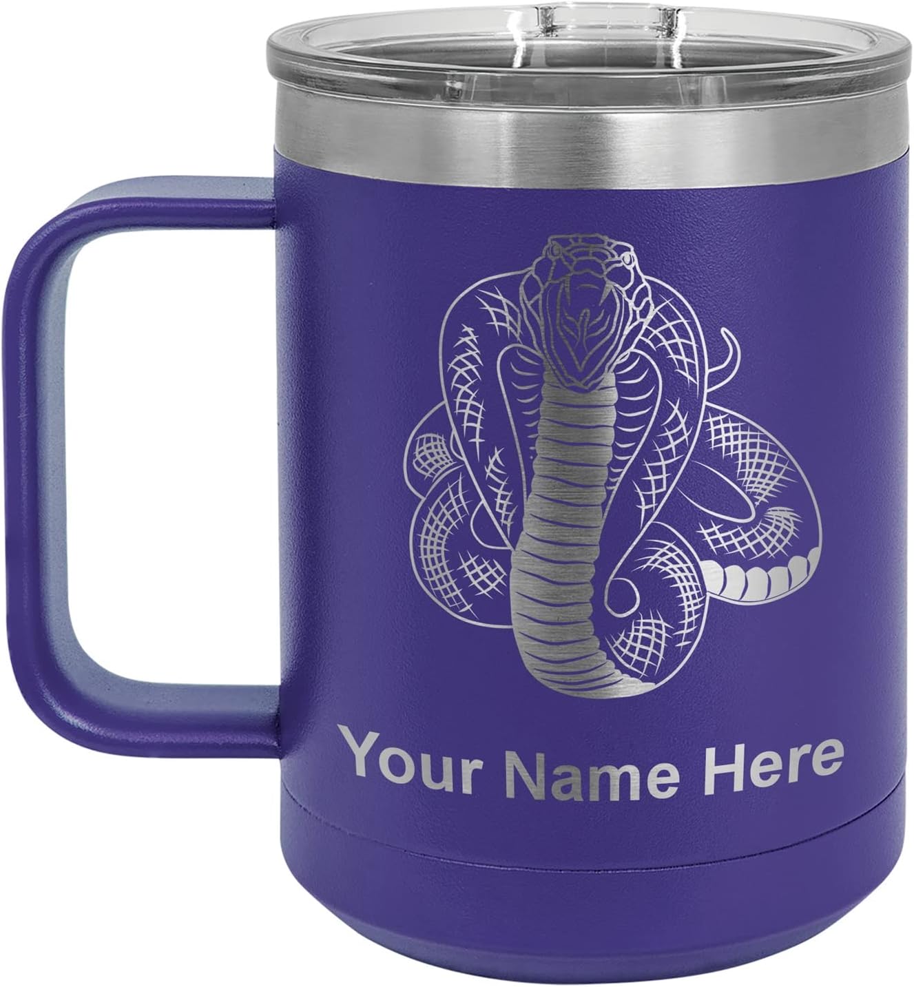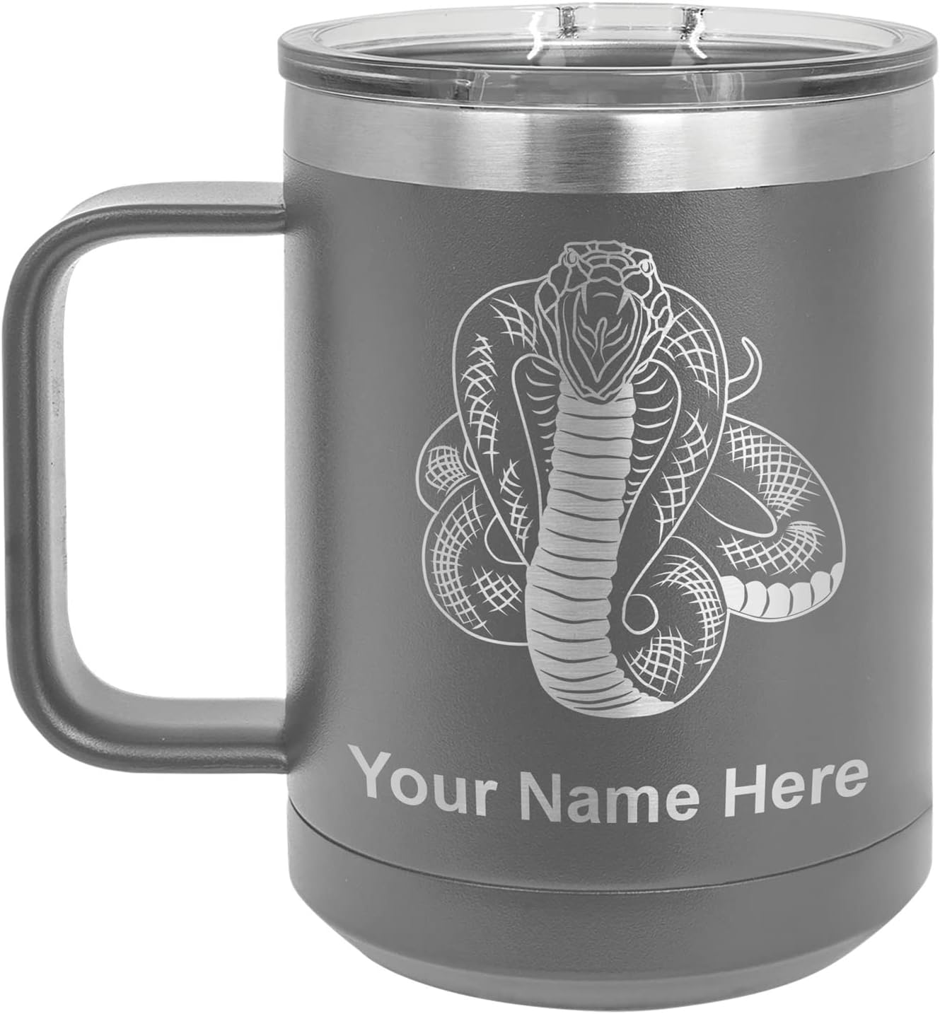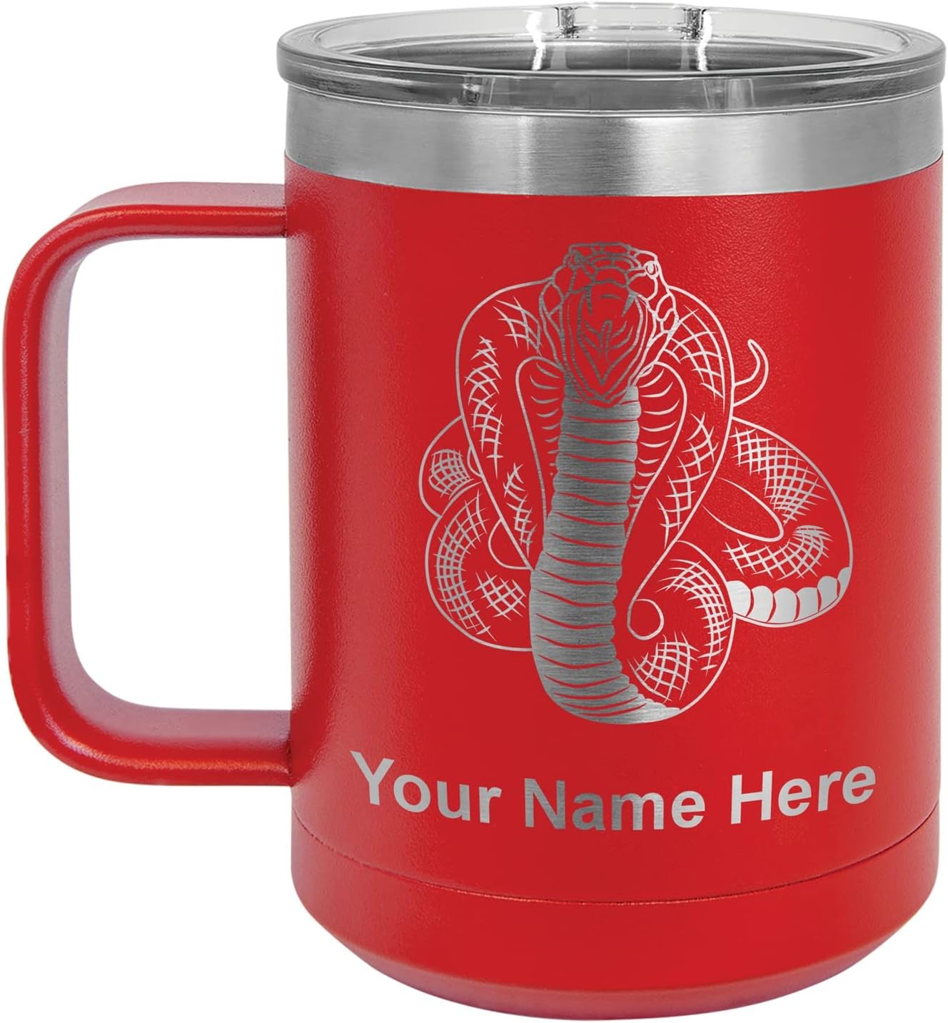 LaserGram 40 ounce Travel Mug with Handle that is laser engraved with the image that you see in the photo. Your own personalized text will be laser engraved below the image. Features double-walled stainless steel vacuum insulation with a clear lid. Click the "Customize Now" button to begin customizing your mug.