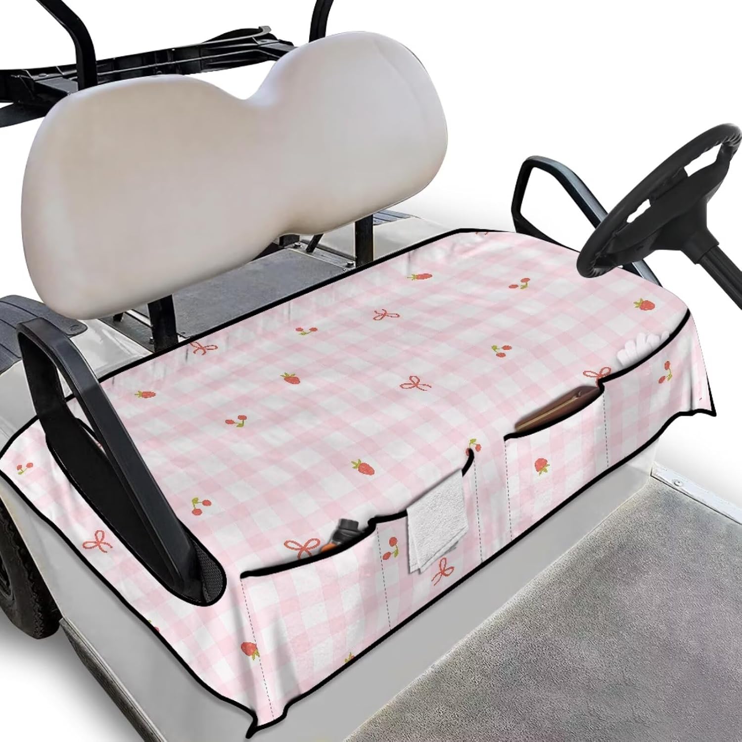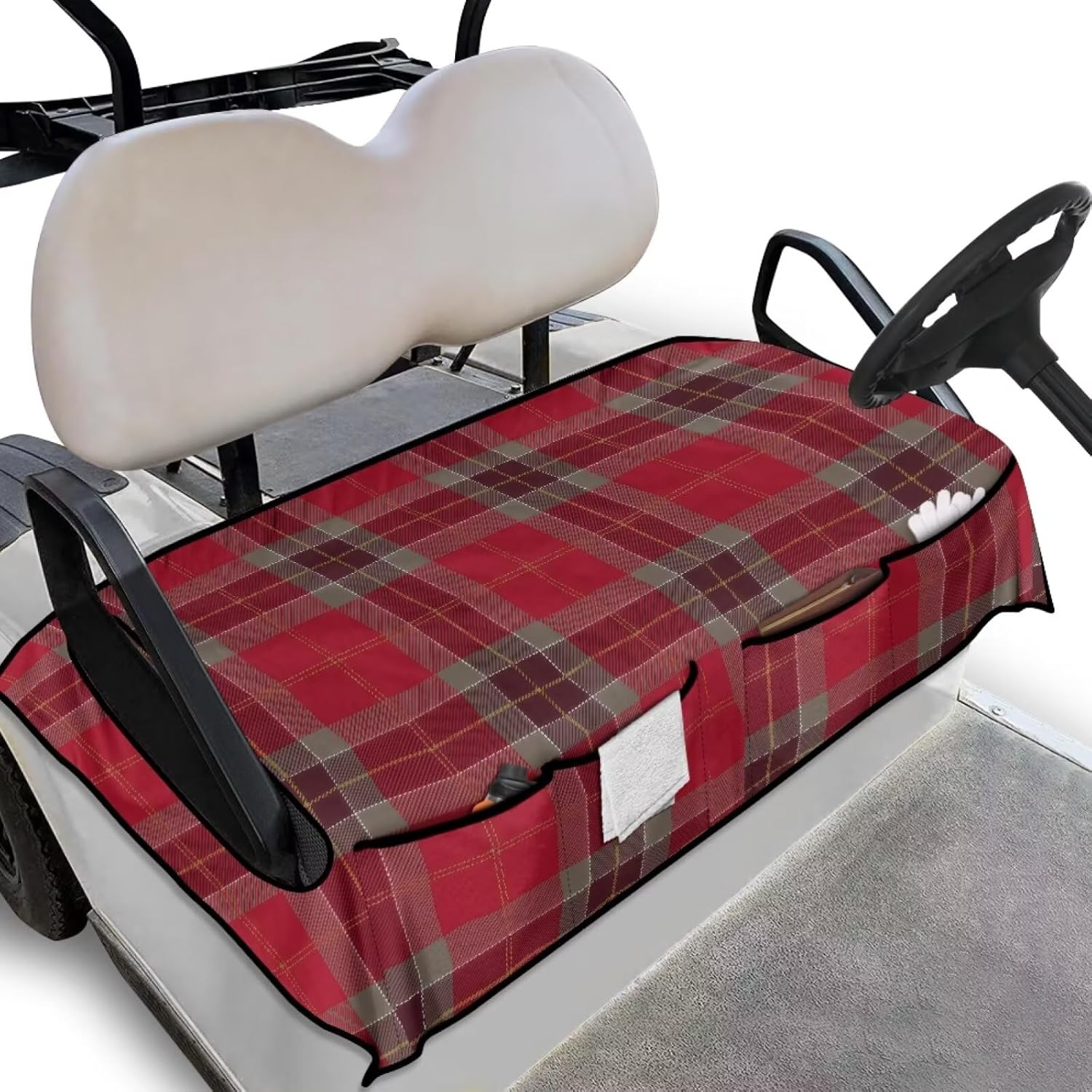 This sightseeing cart/golf cart seat cover fabric has a comfortable stretch, skin-friendly softness, non-slip and abrasion resistance, which is perfect for fall use. It is not easy to fade, has a moderate thickness, and features a full-coverage stitching process that prevents shifting. It fits perfectly to the original seat, minimizing damage to the seat while protecting it from abrasions and scratches, providing moderate protection in both cold and hot weather. It features a personalized and stylish pattern that helps create the perfect first impression for passengers and enhances the attractiveness of the sightseeing bus, has a convenient design with 4 front storage pockets for you to store some accessories, and easily stores sunglasses, towels, gloves and water bottles, and other supplies that come along with the bus.